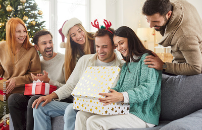 Portrait of a happy young woman sitting on sofa at home with friends on Christmas eve opening big present box celebrating New Year together. Congratulations and winter holiday concept.