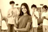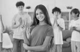 Portrait of a happy schoolgirl is standing in a school classroom, showing a victory sign. Education, with a group of students in the background, symbolizing the back to school spirit.