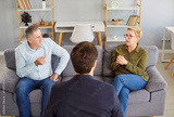 Serious elderly family couple attending a therapy session, engaging in conversation with a psychologist to resolve conflicts or quarrel. Seeking help and improve relationship during meeting.