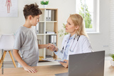 Caring female pediatrician in medical coat holding hand of small boy patient, little kid during regular check health by professional medic children healthcare pediatry, healthcare practitioner support