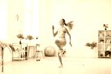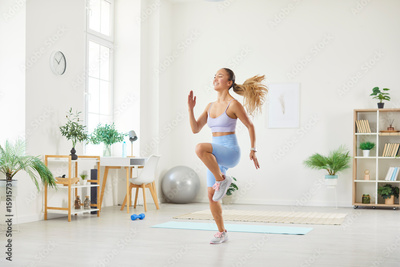 Strong athletic fit girl in top and leggings energetically jogging in spacious and bright living room at home. Sporty happy smiling woman running in place, having fitness workout, training body core.