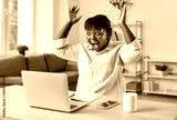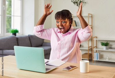 Excited african american woman at home desk in euphoric win online lottery, happy overjoyed getting mail at laptop, promoted at work, shocked amazed reading good news at computer, achieve result