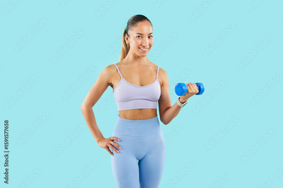 Portrait of young smiling strong sporty happy woman in sportswear standing with raised dumbbell. Fitness trainer instructor with athletic body posing on azure blue background. Workout sport concept.