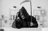 Grim reaper, holding a scythe, sits at an office desk, deep in thinking while working. This eerie monster brings a sense of fear and death to the workplace, blending the supernatural with the mundane.