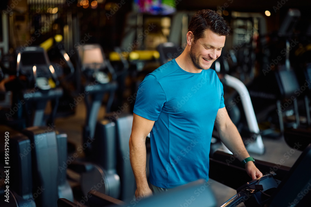 Happy athletic man warming up on treadmill while exercising in gym.