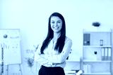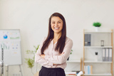Portrait of happy smiling confident young woman company employee wearing formal clothes looking cheerful at camera standing with crossed arms in modern office. Business portrait concept.