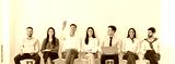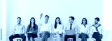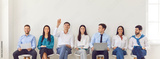 Portrait of happy smiling young man raising hand to ask or answer a question on a business meeting. Group of company employees or a team of staff sitting on chairs in a row during conference.