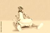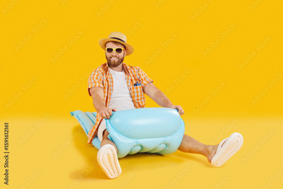 Funny summer vacation happy man in beach wear, tourist riding inflatable rubber sea mattress, plays traveling leisure, dream holiday, enjoys recreation fun travelling pleasure, relaxation, tourism