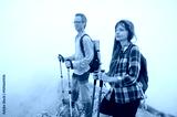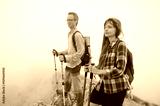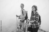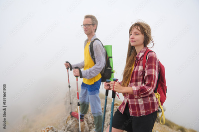 Couple of Hikers Standing in Misty Mountain Vista with Trekking Gear