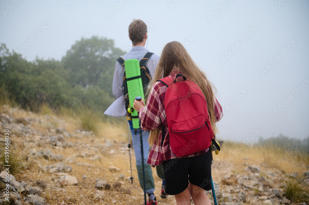 Two Hikers Enjoy Outdoor Adventure in a Scenic Mountain Landscape