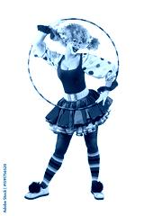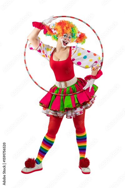 Funny female clown looking through hula hoop, woman entertainer dressed as a colorful Joker in a suit and wig, with clown whiteface makeup. She is a professional actor at events