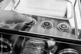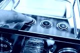 Barista finger presses button on shiny espresso machine to start brewing process during coffee preparation in modern café.