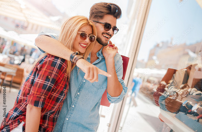 Shopping time. Young couple in shopping. Consumerism, love, dating, lifestyle concept
