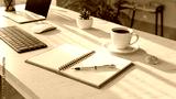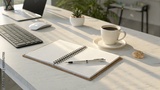 Work from home aesthetic with coffee, notebook, and laptop on a bright and modern desk setting with productivity vibes.