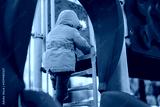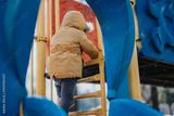 Young child wearing winter coat and pants climbs a bright playground ladder, showcasing energy and exploration during a chilly outdoor day.