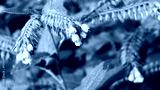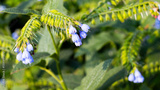 Delicate blue flowers bloom among lush green foliage in a serene garden setting during the golden hour of nature's beauty