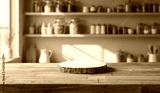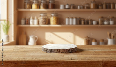 Bright kitchen interior with sunbeams lighting shelves and containers on the wall – wooden table with pedestal in foreground for product placement and home cooking presentation