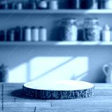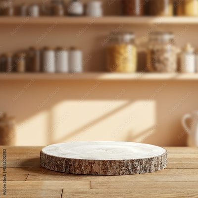 Bright kitchen interior with sunbeams lighting shelves and containers on the wall – wooden table with pedestal in foreground for product placement and home cooking presentation