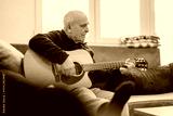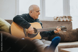 An elderly man focusing on playing an acoustic guitar while sitting comfortably in a well-lit living room, conveying a mood of relaxation, creativity, and the joy of musical expression.