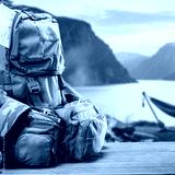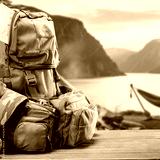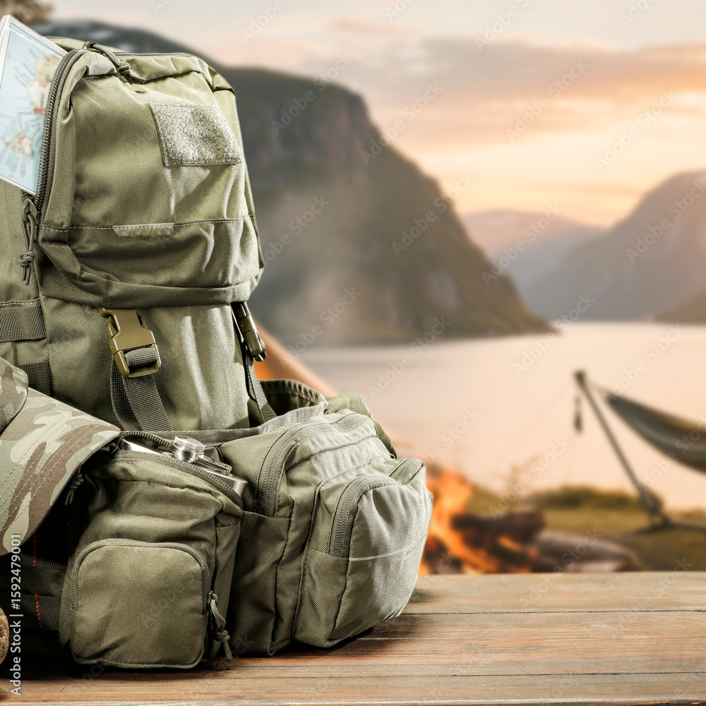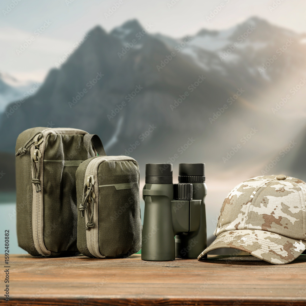 Camping and hiking gear on rustic wooden surface in mountain forest landscape – backpack, binoculars, hat and bottle ready for outdoor adventure in scenic wilderness background