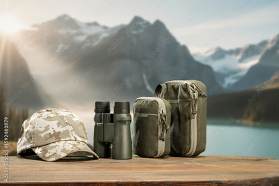 Copy space and camping and hiking gear on rustic wooden surface in mountain forest landscape – binoculars and hat ready for outdoor adventure in scenic wilderness background