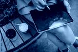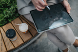 A person works on a digital tablet while seated on a wooden bench by plants, accompanied by cups of coffee and water, reflecting a casual and modern working or leisure environment.