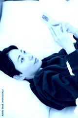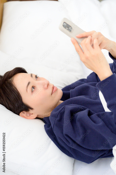 ベッドで仰向けでスマホを操作する日本人女性
