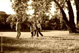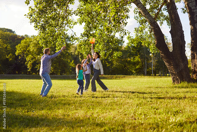 Happy smiling family of four playing with a ball in the park on green grass spending time together at summer holidays. Young parents with kids in casual clothes having fun outdoors in nature.