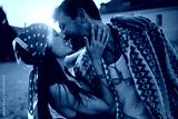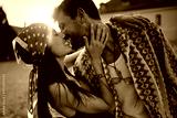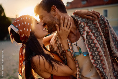 Carefree couple kissing during summer music festival at sunset.