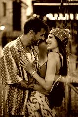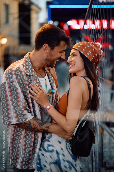 Happy couple in love attending music festival in summer.
