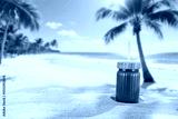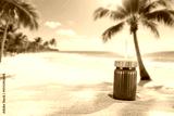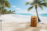 Brown tropical drink with straw on golden sand under palm trees – summer beach scene with copy space for product placement, ocean and blue sky in background, exotic vacation vibe