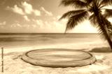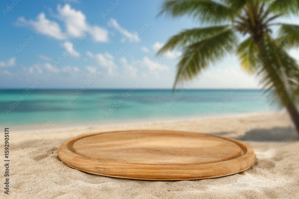 Round wooden pedestal for product placement on golden beach sand – tropical background with palm trees, turquoise ocean and blue sky – summer branding and exotic lifestyle concept
