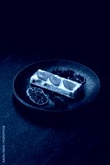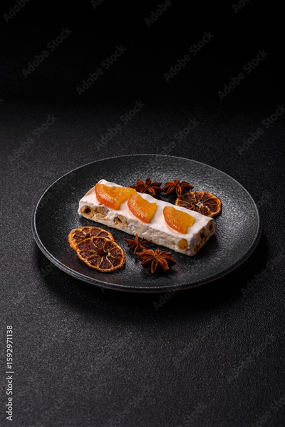 Nougat or white caramel with hazelnuts and pistachios and citrus pieces. White nougat with nuts
