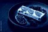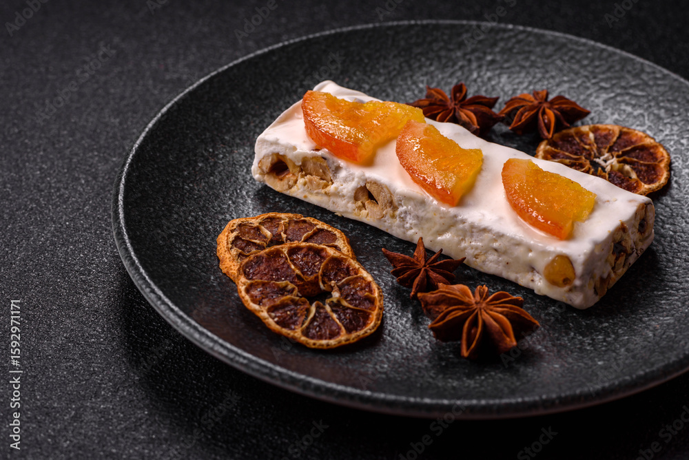 Nougat or white caramel with hazelnuts and pistachios and citrus pieces. White nougat with nuts