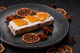 Nougat or white caramel with hazelnuts and pistachios and citrus pieces. White nougat with nuts