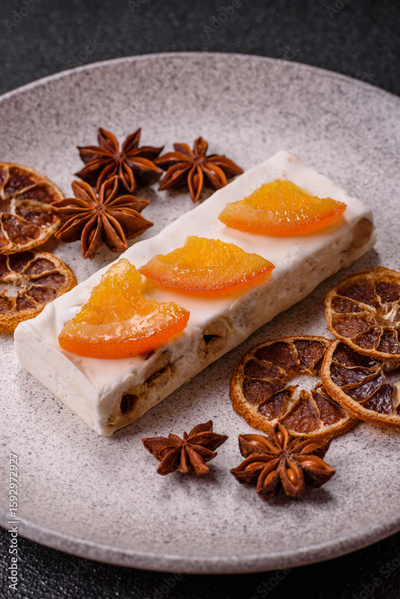 Nougat or white caramel with hazelnuts and pistachios and citrus pieces. White nougat with nuts