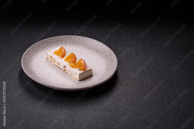 Nougat or white caramel with hazelnuts and pistachios and citrus pieces. White nougat with nuts