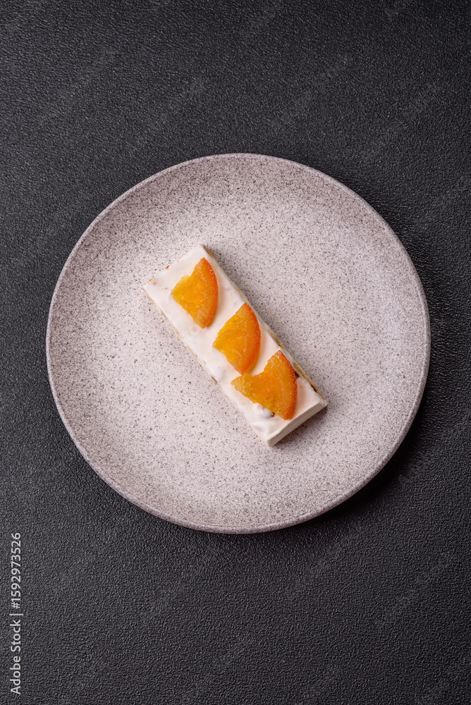 Nougat or white caramel with hazelnuts and pistachios and citrus pieces. White nougat with nuts