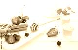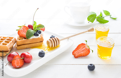 Breakfast in the morning with waffles, honey and berries