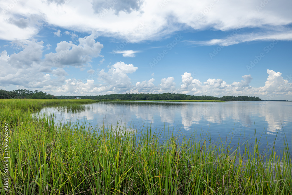 Tranquil waters reflect fluffy clouds under a bright sky near a vibrant green marshland