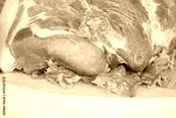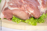 Raw cervical carbonate of pork on cutting board with leaves of green salad, isolated on white background