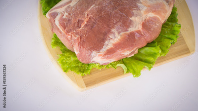 Raw cervical carbonate of pork on cutting board with leaves of green salad, isolated on white background