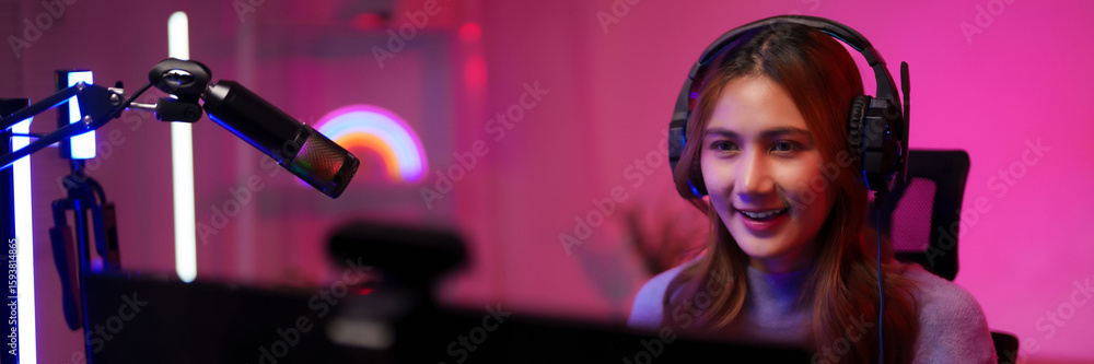 Asian young woman live streamer gamer online broadcasting vibrant home studio professional headphones microphone creating digital entertainment content