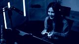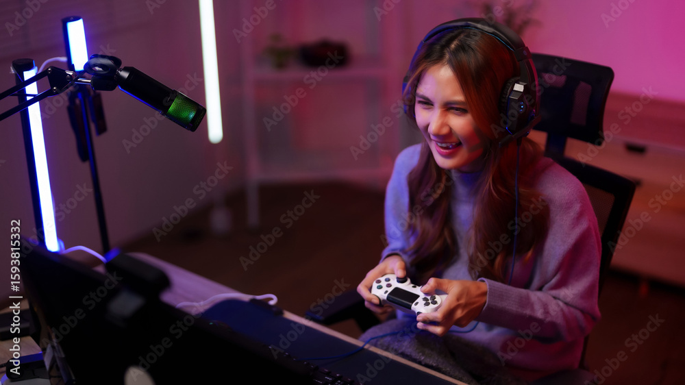 Asian female streamer playing video game with controller headset and microphone at professional gaming studio setup