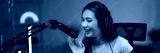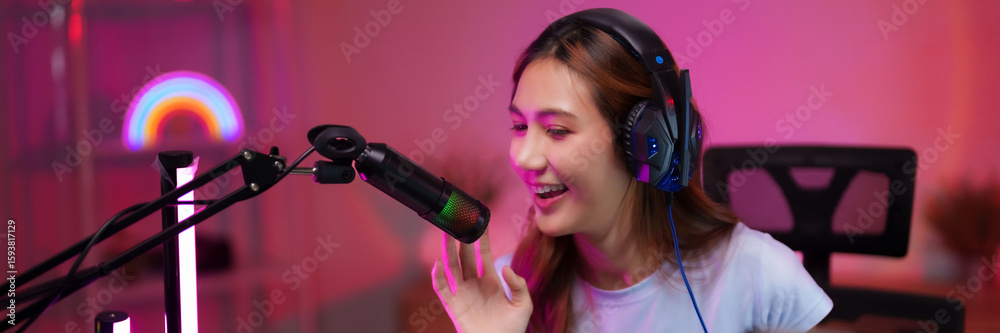 Young adult Asian woman streamer broadcasts live content podcast talks online bright neon lights background digital communication