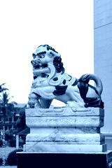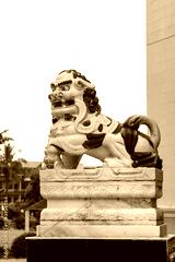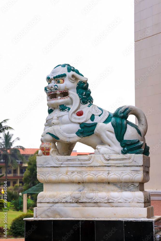 A traditional white large lion statue at Namdroling Monastery in Kushal Nagar, Coorg, India
