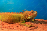 Close up view of large Indian Bearded lizard on the red soil against blue background.