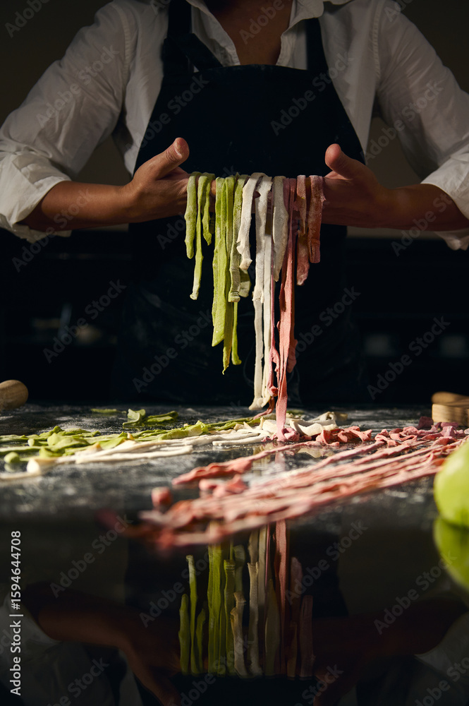 Chef Crafting Vibrant Tricolor Pasta Highlighting Italian Culinary Traditions