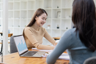Two asian Businesswoman using tablet and laptop reviewing digital financial graphs and reports working in office desk.
