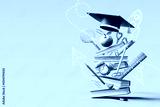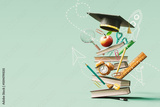 School accessories on green background with copy space. Ready for school concept design. 3D Rendering, 3D Illustration